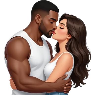Black muscular man kissing Spanish woman with long hair hugging emoji