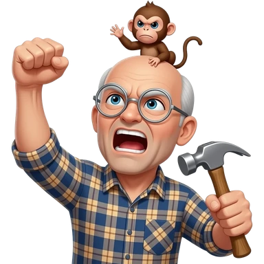 Angry old man with a plaid shirt with silver round glasses balding, NO facial hair yelling at the sky and shaking his fist at the sky holding a hammer in his LEFT hand with a angry baby monkey on his head. emoji