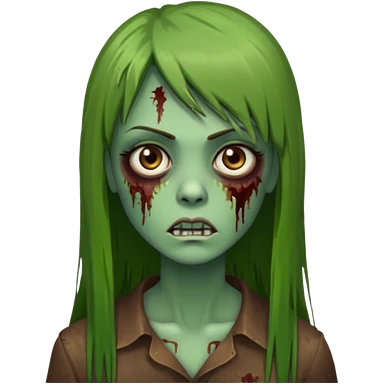 Zumbi feminino, de pele verde, cabelo longo liso e castanho com franja. rosto oval e cilios grandes emoji