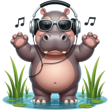 пухлый бегемотик в болоте голый на четырех ногах в наушниках и серебристых солнцезазитныъ очках слушает музыку в гиперреализме emoji