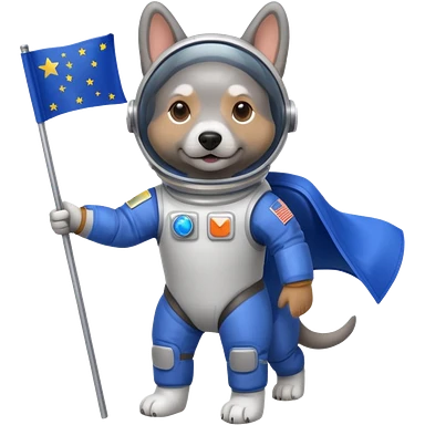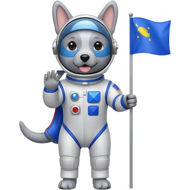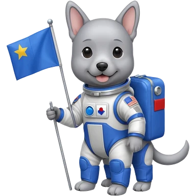 a gray dog in space suit, holding blue rectangle flag, full body, front view emoji