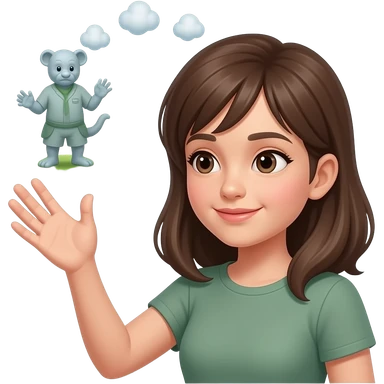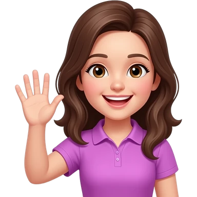 девушка более счастливая махает рукой, феолетово розовая одежда, приветствует на лекции emoji
