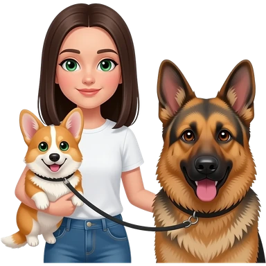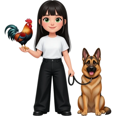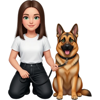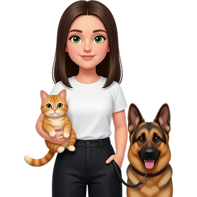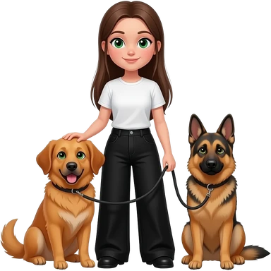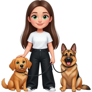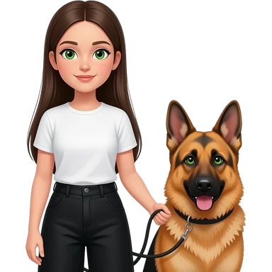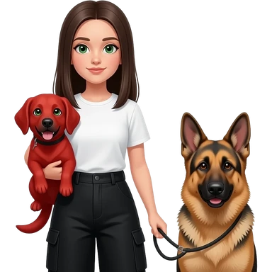 Сделай девочку брюнетку прямые длинные волосы темно зеленые глаза в белой футболке она не должна быть длинно и заправленнойв оверсайз черных штанах в руках у нее рыжий кок со светло зелеными глазами и еще у нее в руке поводок черный от немецкой овчарки и ета собака коло девочки emoji