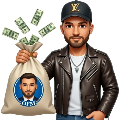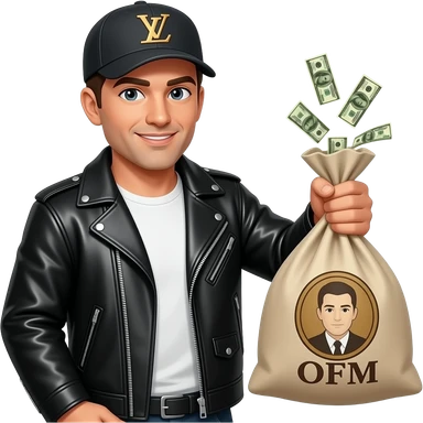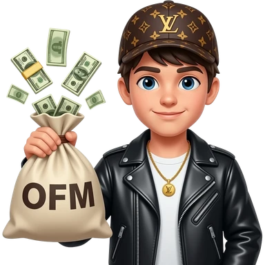 Парень в кожаной куртке, в кепке LV. В руках сумка с нее выпирают деньги, на сумке надпись "OFM" emoji