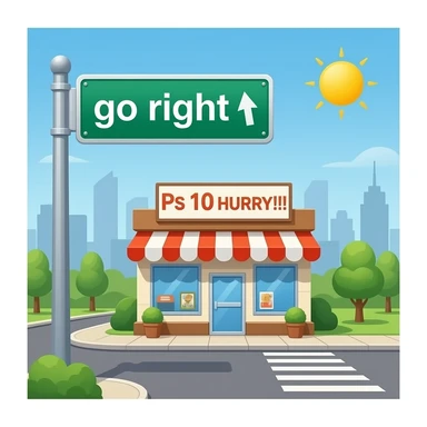 a sign that says go right and there is a store that has a PS 10 HURRY!!!! emoji