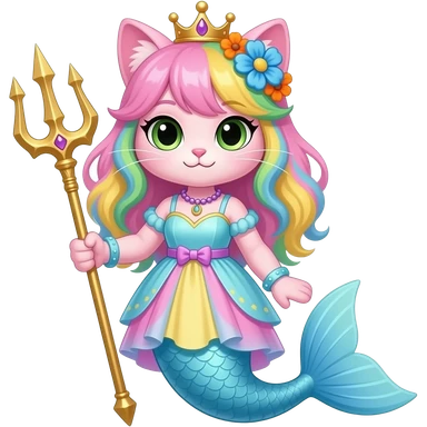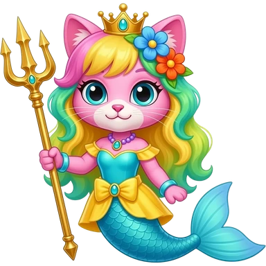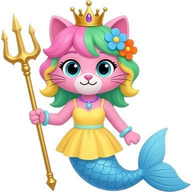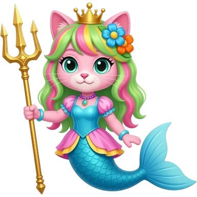 pink anthro cat with pink and green and yellow hair blue flower orange flower golden crown with light purple necklace light cyan braclets cyan and pink and yellow dress with attached to cyan and light blue mermaid tail with dark blue fins holding a golden trident emoji