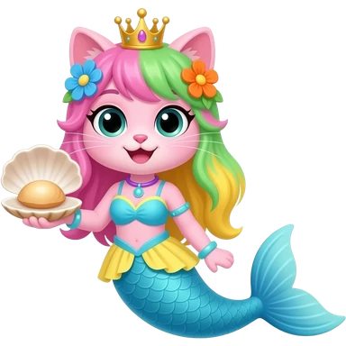 pink anthro cat with pink and green and yellow hair blue flower orange flower golden crown with light purple necklace light cyan braclets cyan and pink and yellow dress with attached to cyan and light blue mermaid tail with dark blue fins holding a clam emoji