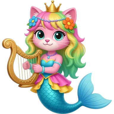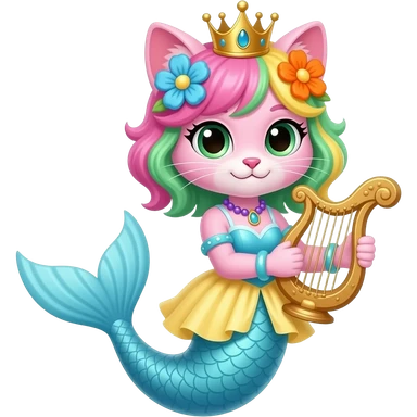 pink anthro cat with pink and green and yellow hair blue flower orange flower golden crown with light purple necklace light cyan braclets cyan and pink and yellow dress with attached to cyan and light blue mermaid tail with dark blue fins holding a golden harp emoji