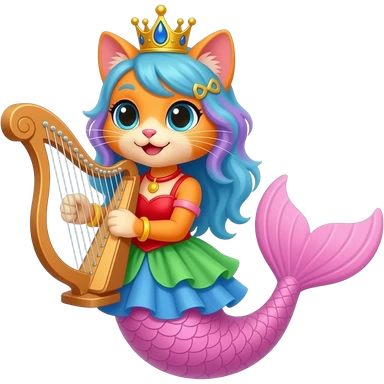 anthro cat with orange and blue and purple hair blue golden crown with light red necklace light yellow braclets red and green and blue dress with attached to pink and light pink mermaid tail with light pink fins holding a harp emoji