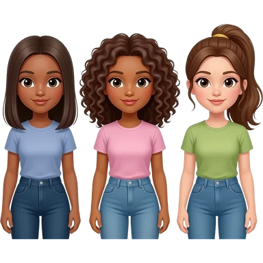 Make three girls, one with straight dark brown hair, one with curly brown hair and one with a high ponytail emoji