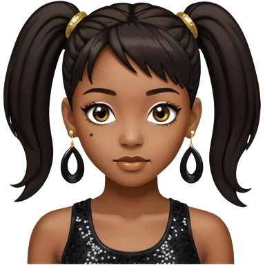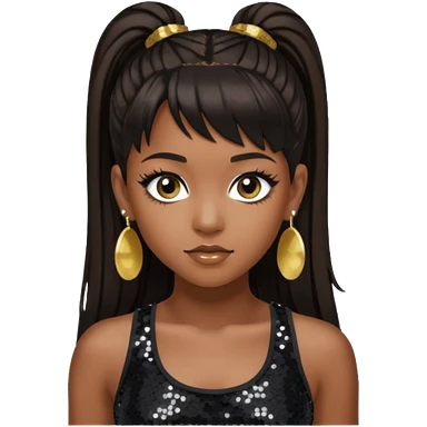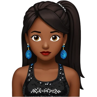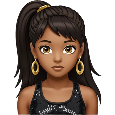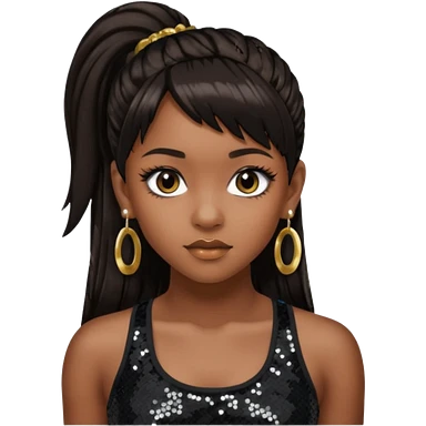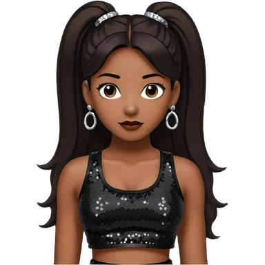 Chilli from TLC with long dark brown ponytail hair, black sequin crop top, black earring, dark skin emoji