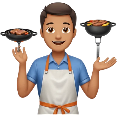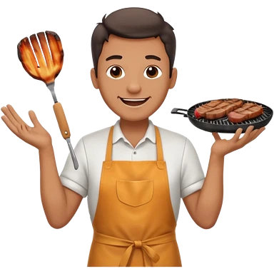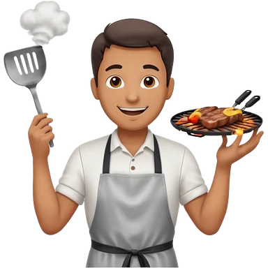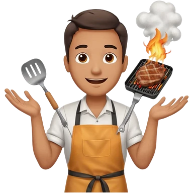 A cheerful man in an apron flipping meat on a sizzling grill with smoke puffing upward. emoji