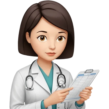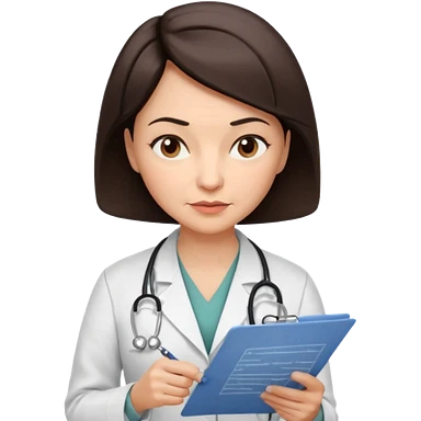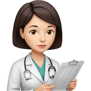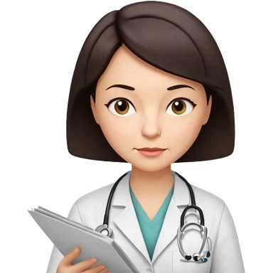 A female doctor in her 50s with visible facial wrinkles, dark brown short bob hair, her body turned slightly at an angle, with her gaze clearly directed downward and fixed on the medical chart she is reviewing. emoji