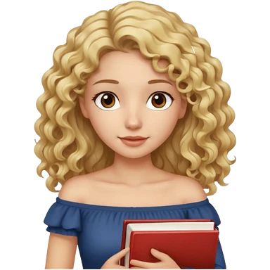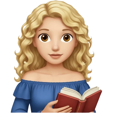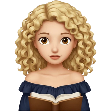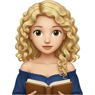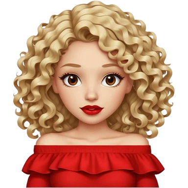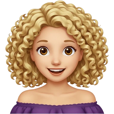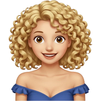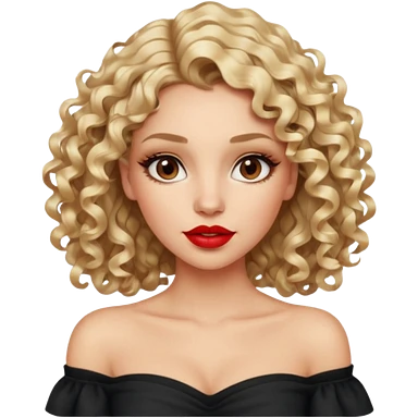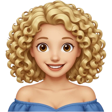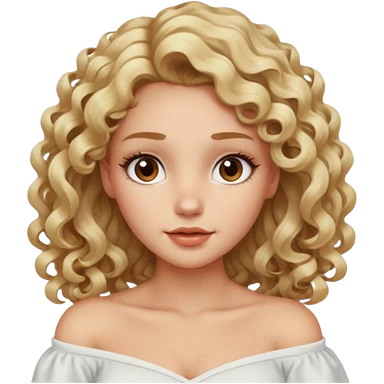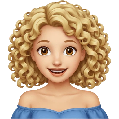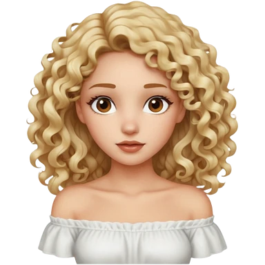 exaggerated features of woman with curly long blond hair, brown eyes, wearing an off-shoulder top, emoji