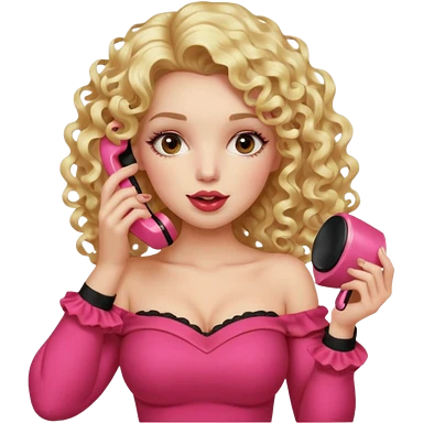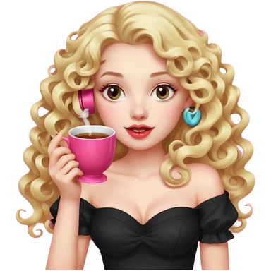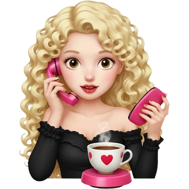 exaggerated features of woman with curly long blond hair, gossiping on a pink analogue phone, holding a tea cup, wearing an off-shoulder black top, red face emoji
