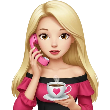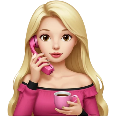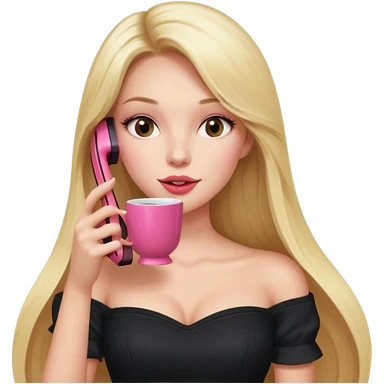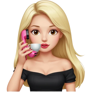 exaggerated features of woman with straight long blond hair, gossiping on a pink analogue phone, holding a tea cup, wearing an off-shoulder black top, red face emoji