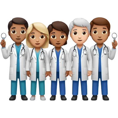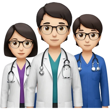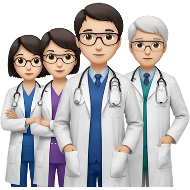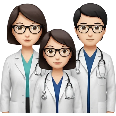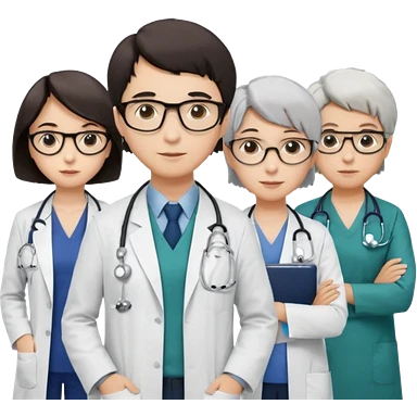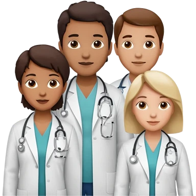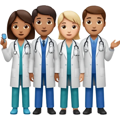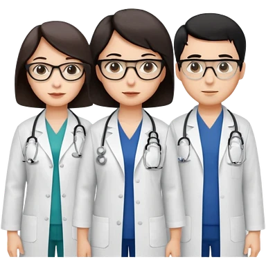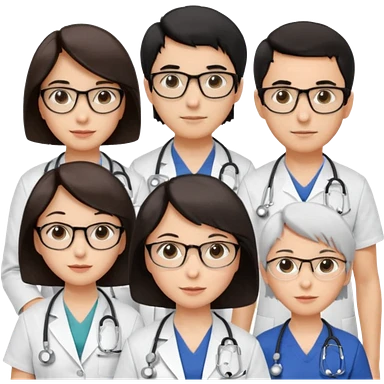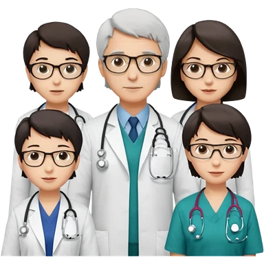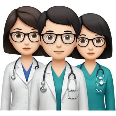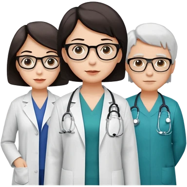 Create four doctors grouped together. Place a female doctor with dark brown short bob hair prominently in the front. Behind her, include: a doctor with white hair wearing glasses, a young male doctor with black hair and no glasses, and a female doctor with black short bob hair wearing glasses. emoji