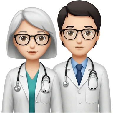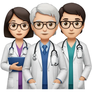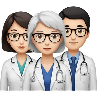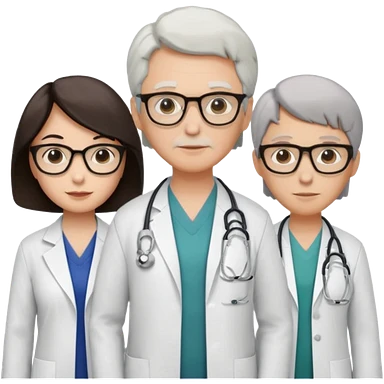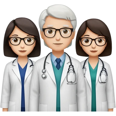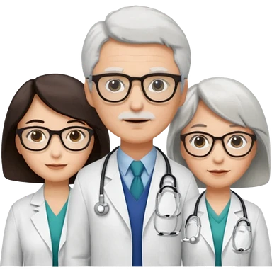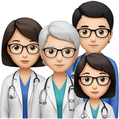 Four doctors standing together: a female doctor with dark-colored short bob hair, a young male doctor, an older male doctor with white hair wearing glasses, and a female doctor wearing glasses. emoji