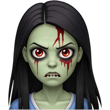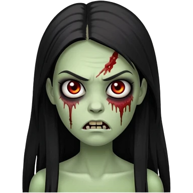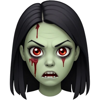 девушка зомби с темными длинными прямыми волосами, с черными макияжем глаз, тонкими бровями, со злым выражением лица в стиле Apple avatar emoji