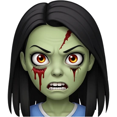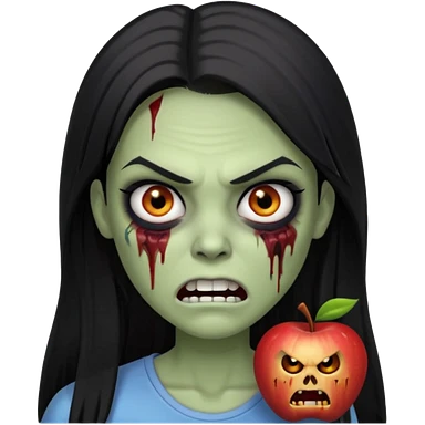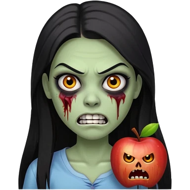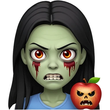 девушка зомби с темными длинными прямыми волосами, с черными макияжем глаз, тонкими бровями, со злым выражением лица и ровными белыми зубами в стиле Apple avatar emoji