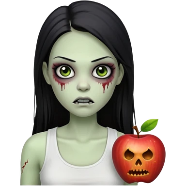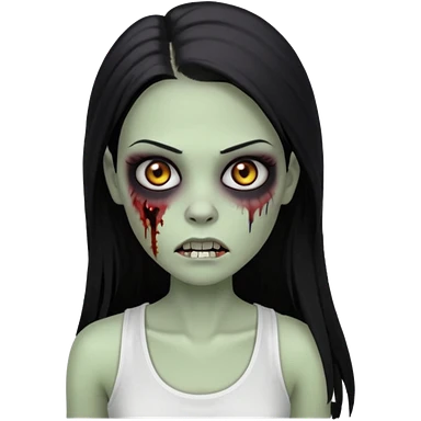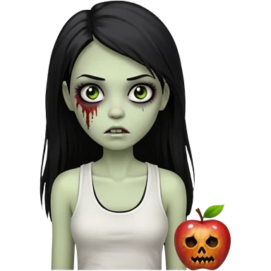девушка зомби с темными длинными прямыми волосами, с черными макияжем глаз, тонкими бровями в стиле Apple avatar, оделся в белую майку emoji
