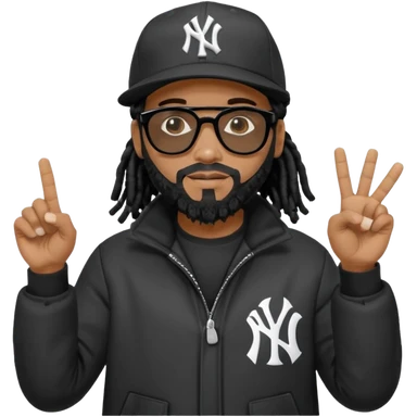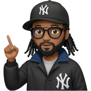 African American man with shoulder length black dreadlocks with black beard wearing black sunglasses wearing a New York Yankees logo baseball cap wearing a dark black bubble winter coat hand pointing out emoji