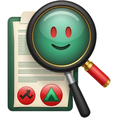 Create a clean emoji-style icon representing “Challenge Review”.Include a document with a red warning symbol, a magnifying glass overlay ,magnifying glass of dark green color and a small refresh arrow. emoji