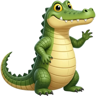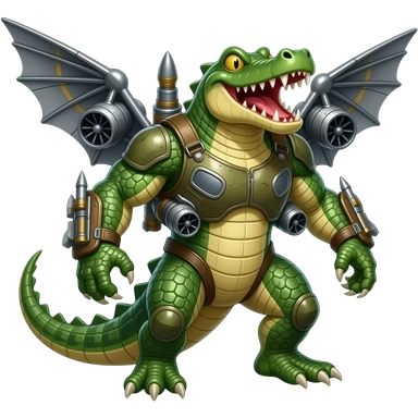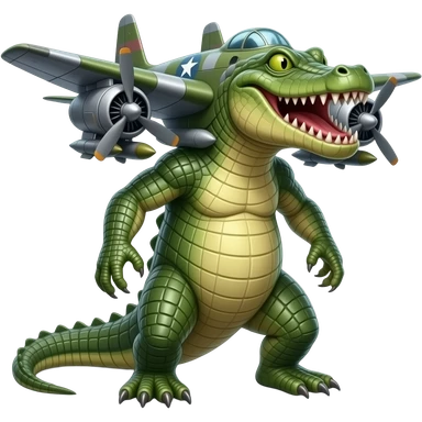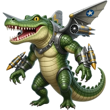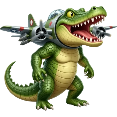 Surreal hybrid creature: a crocodile fused with a military bomber plane — green scaly body, metal wings, jet engines, and missiles. Aggressive grin, cartoon-realistic style, cinematic lighting. emoji