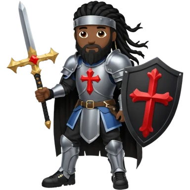 African American with long black dreadlocks with black beard wearing a black knight amour wearing wearing black Air Force 1 low top shoes holding a shield with cross on it and a double edge sword emoji
