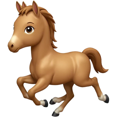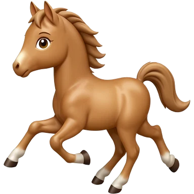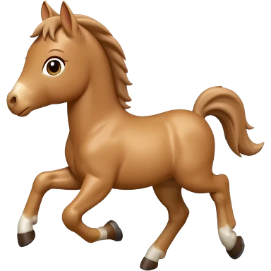 3D Apple-style emoji of a running foal. Small young horse with light brown body, short mane, big eyes, rounded and glossy, smooth shading, white background. emoji