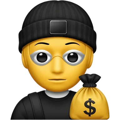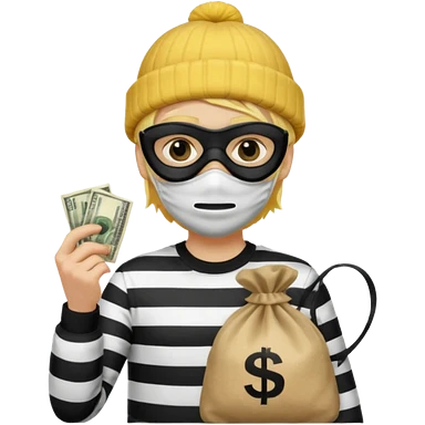 A yellow guy with a black beanie white black striped shirt a black mask for it's eyes and holding a money bag with yellow hair emoji
