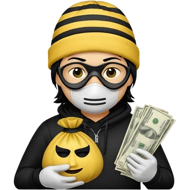 A yellow guy with a black beanie white shirt with black stripes a black mask for it's eyes and holding a money bag with yellow hair emoji
