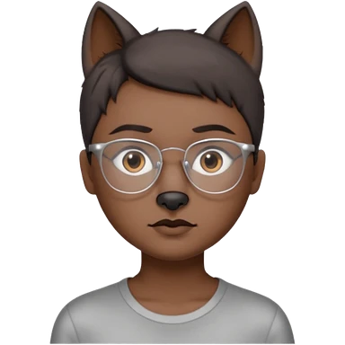 personagem com Wolf cut curto, cabelo castanho escuro, olho castanho escuro, sombrancelha castanho escuro, óculos sem aro prata. emoji