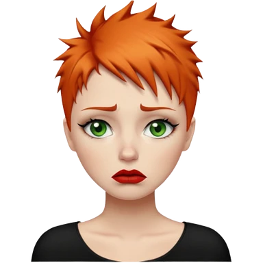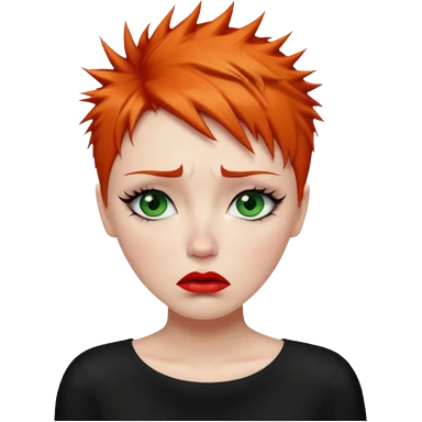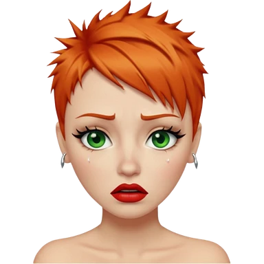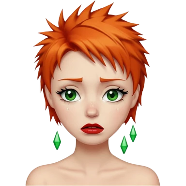 Short spikey Ginger hair, green eyes, black long eye lashes large red lips White woman very sad crying years coming out or eyes emoji
