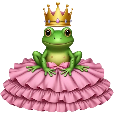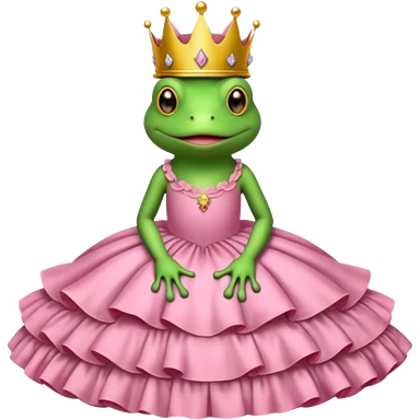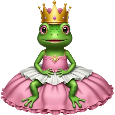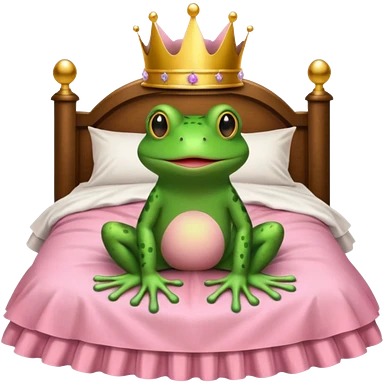 Brown bed with white sheets and a pink comforter. In the bed sits a frog in a frilly little pink dress, wearing a crown and sitting like a frog would normally sit. emoji
