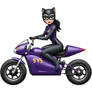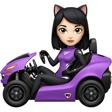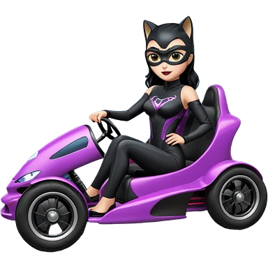 full size real-appearance electric road racing sexy CatWoman’s feminine midnight-colored tight outfit sixty’s tv show dark stealthy accurate sporty safe plush deluxe off-road pursuit cruiser car jaguar accents (black hair,reclined and relaxed torso and shoulders seating position) go kart emoji
