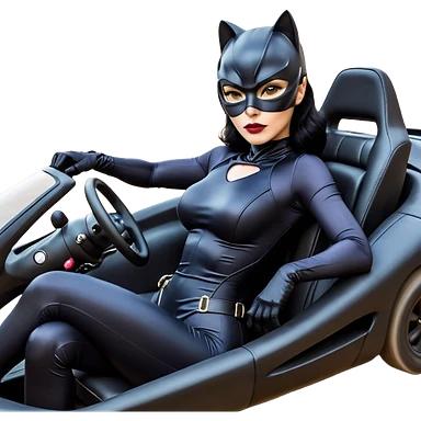 full size real-appearance electric road racing sexy CatWoman’s feminine midnight-colored tight outfit sixty’s tv show dark stealthy accurate sporty safe plush deluxe off-road pursuit drifting car jaguar accents (black hair,reclined and relaxed torso and shoulders seating position) go kart emoji