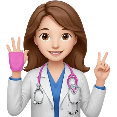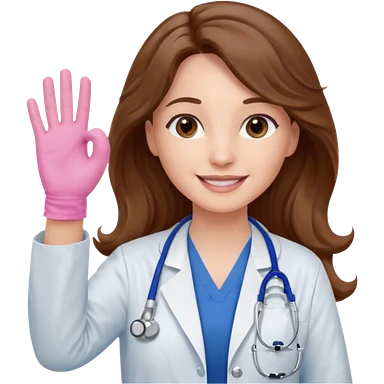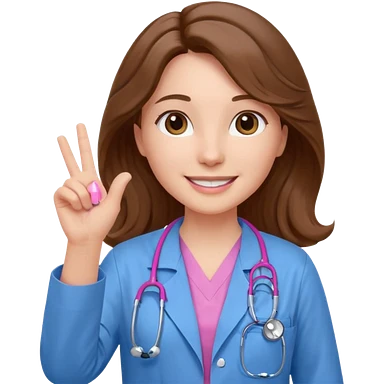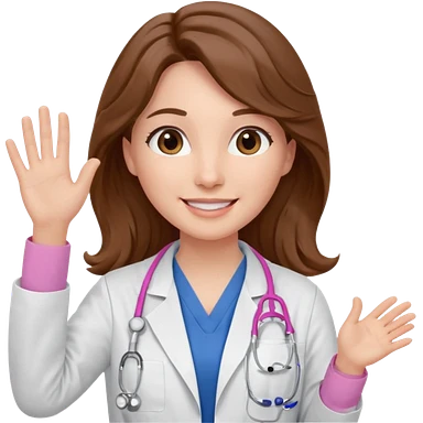 Barbie like emoji of a white woman with brown eyes and long wavy brown hair wearing blue scrubs, white lab coat, pink stethoscope, and raising one hand and a warm smile emoji