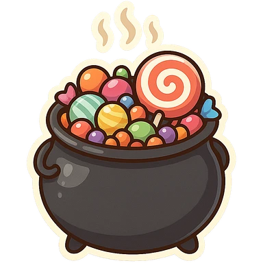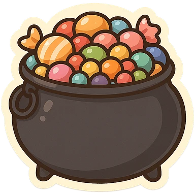 一口坩埚,锅里面装着许多彩色的糖果 emoji