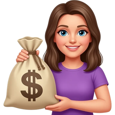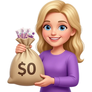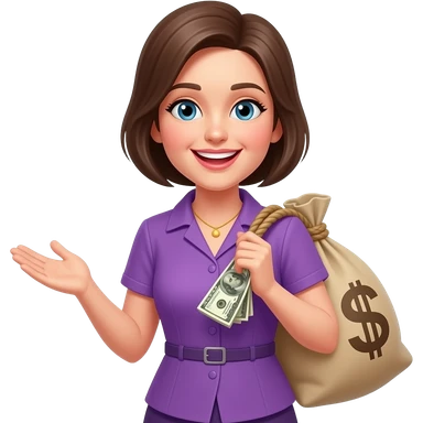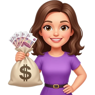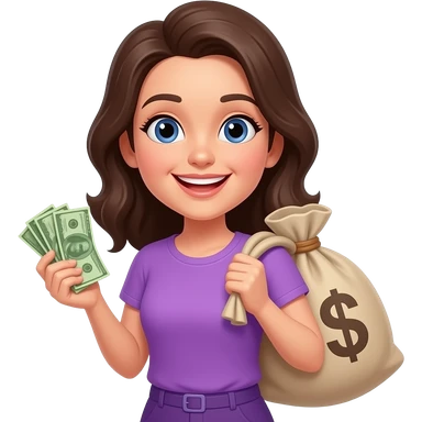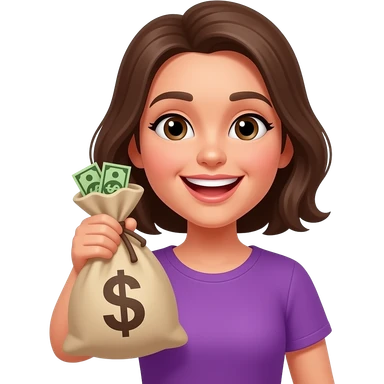 Счастливая женщина с мешком денег в фиолетовой одежде emoji
