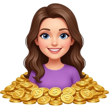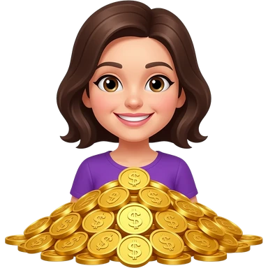 Счастливая женщина с кучей золота без валюты и значков на деньгах свитки, чтобы не видно было, что доллар, в фиолетовой одежде emoji