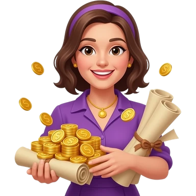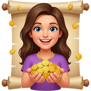 Счастливая женщина с кучей золота без валюты свитки в фиолетовой одежде emoji