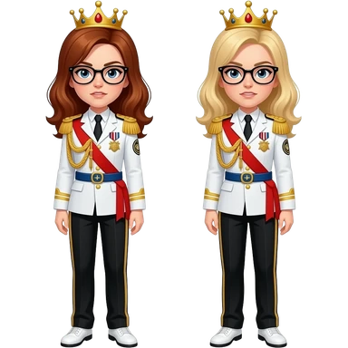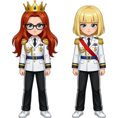 brown bushy auburn haired female android 21 and blonde shoulder length haired android 18 from dragon ball fighterz are wear gold tiara black glass white military tunic arm badge shoulder cord medal red sash blue belt black trouser with two side stripes white shoes and become as evilness emoji