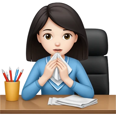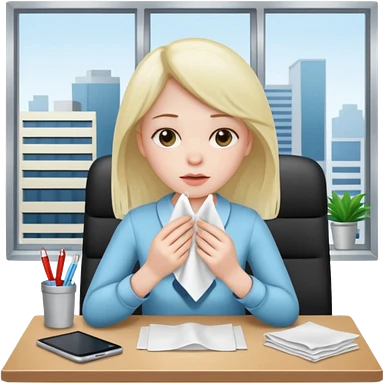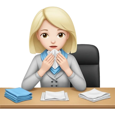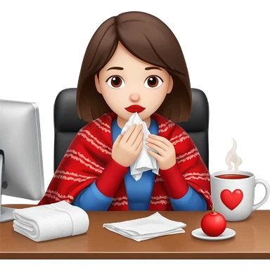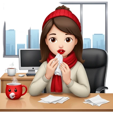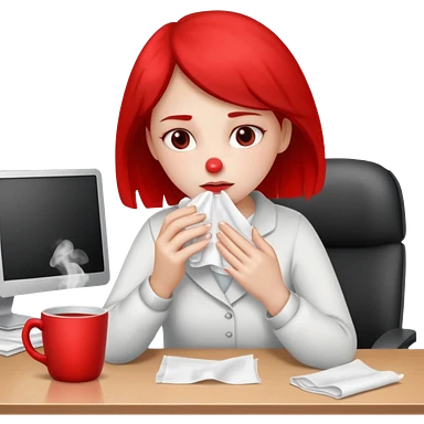 хвора дівчина сидить в офісі за столом, у неї в руках хустинка, червоний ніс, на столі серветки, чай emoji | AI Emoji Generator