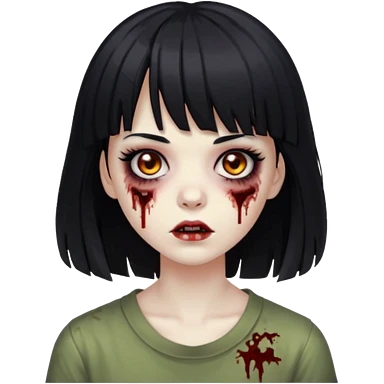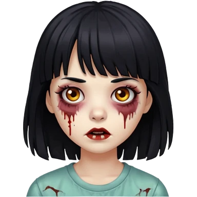 Zombie girl, black hair with bangs, slightly wavy, layered haircut, long eyelashes, black eyes. emoji