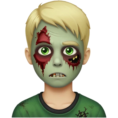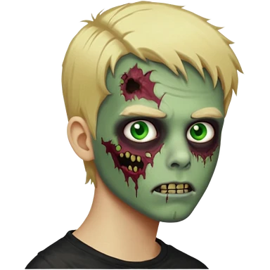 Rosto de frente classico de zombie boca meio torta cabelos pretos no corte low fade com pele verde clara camiseta branca emoji