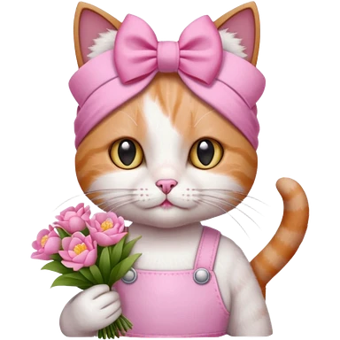 گربهای که دستش یه دسته گل صورتی سفید باشه رو سرش پاپیون باشه و لباس صورتی سفید تنش باشه حالت بیلر داشته باشه و یه کادر کوچیک که نشونه فکر بالا سرش باشه emoji