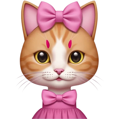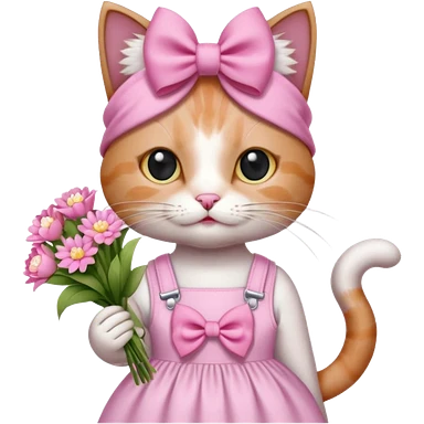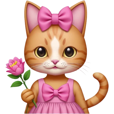 گربهای که یه گل صورتی دستش باشه رو سر خودش پاپیون باشه لباس صورتی تنش باشه و یک کادر صورتی کوچیک بالای سرش باشه emoji | AI Emoji Generator