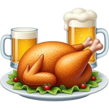 치킨에 맥주한잔 하는 미팅이 생겼어. 치킨이 가운데 접시에 놓여있고, 좌 우에 맥주가있는 이모지를 만들어줘. (인물 필요없음) emoji