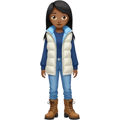 asin girl with black long slick backed hair wearing a dark blue long shirt and a puffy white sleeveless jacket on outside and light blue very baggy jeans with brown boots emoji